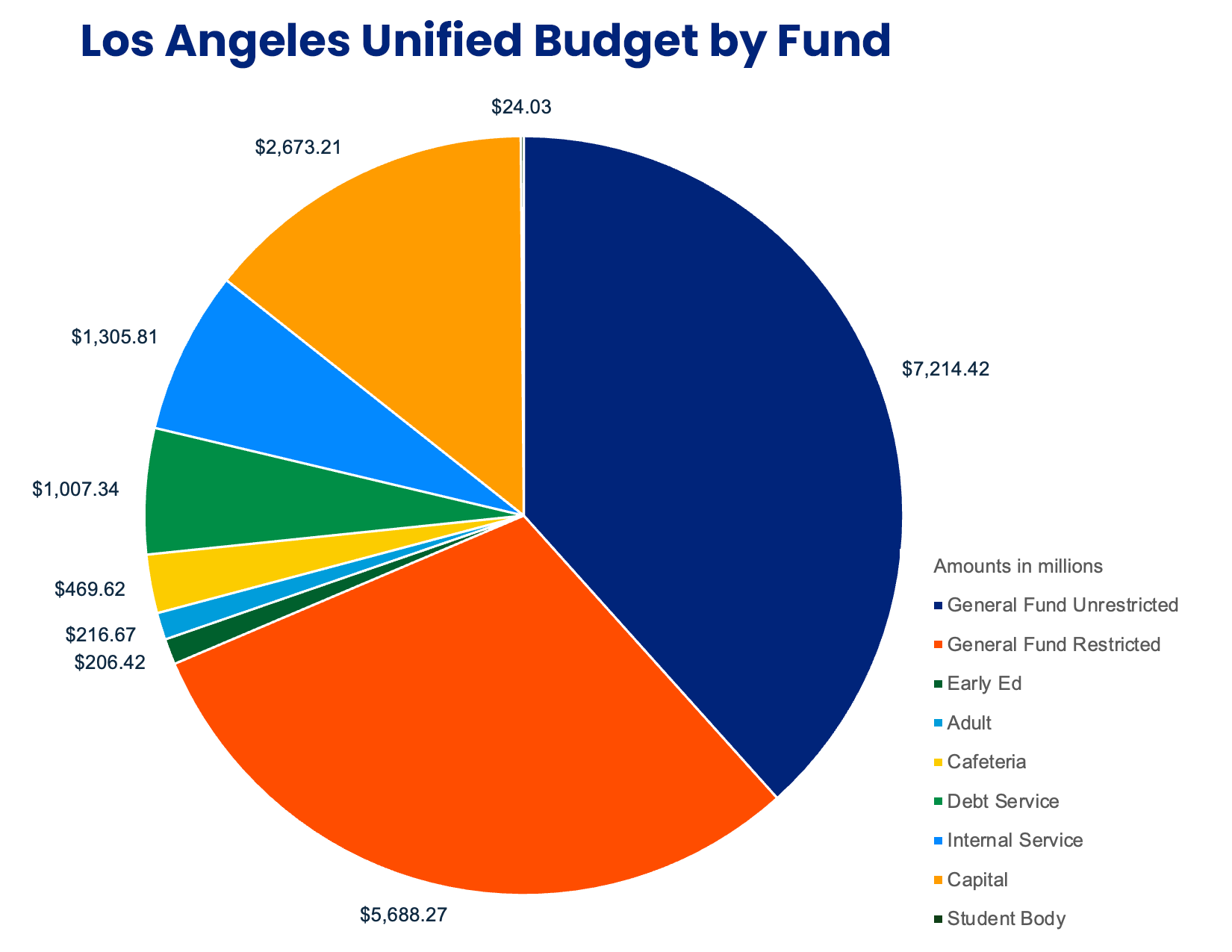 The Los Angeles Unified Budget is divided into 9 separate categories; General Fund Unrestricted, General Fund Restricted, Adult Education Fund, Early Education Fund, Cafeteria Fund, Student Body Fund, Internal Service Fund, Debt Service Fund, and Capital Projects Fund. 8 of the 9 funds are restricted in the sense that the monies in the respective funds cannot be used outside of the intended use, thus only General Fund Unrestricted dollars can be used discretionarily for general education purposes.